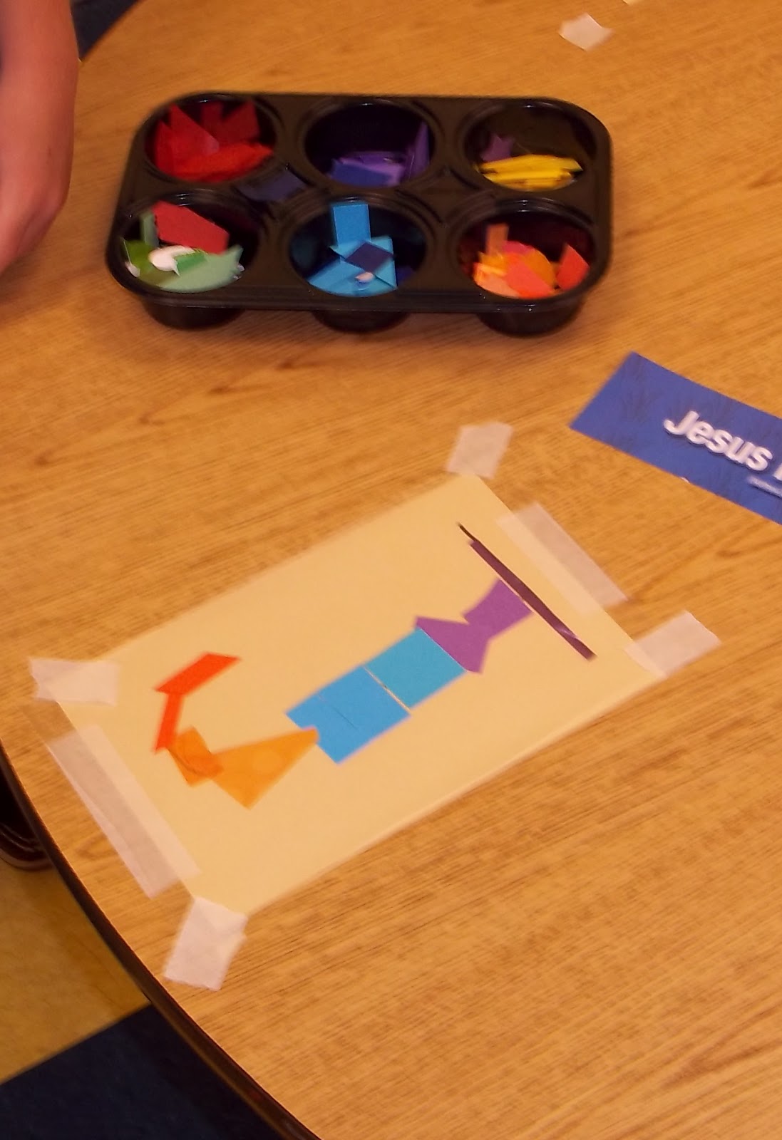This week we made letter mosaics. Since we were talking about Easter and Jesus, we all made "J" mosaics. On a piece of paper we made a large J (for each place) and taped the letter to the table. Then we placed a piece of sticky paper over the letter, sticky side face up. (We taped the corners to keep it in place.)